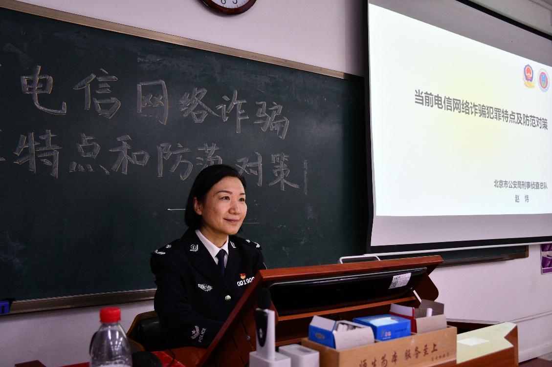讲座中,赵炜警官结合北京高校上半年发案1100余起、损失近亿元等数据及我校典型案例,剖析了电诈“贪、怕、慌、善、缺、过于自信”六大受害者心态,指出犯罪已呈现职业化、产业化、跨区域化特征,诈骗手段随社会热点不断迭代且隐蔽性增强。针对校园群体,赵炜警官重点梳理了冒充公检法、刷单返利、投资理财等八类高发诈骗类型,并给出针对性警示。